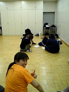 一人ストレッチをするいっぺーちゃん、打ち合わせをする遠藤さん、尚さん、それを聞くでら、香織ちゃん、そして皆をあたたか~く見守る(笑)高野さんです(^^ゞ