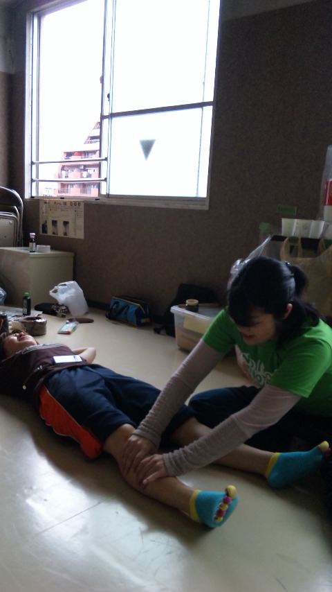疲れ果てた南番役・香織ちゃんの脚をマッサージしている制作・きくさん。