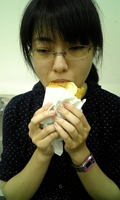 片隅でパンを食べる柏木史江。最近彼女は気付くといつも何か食べてます。