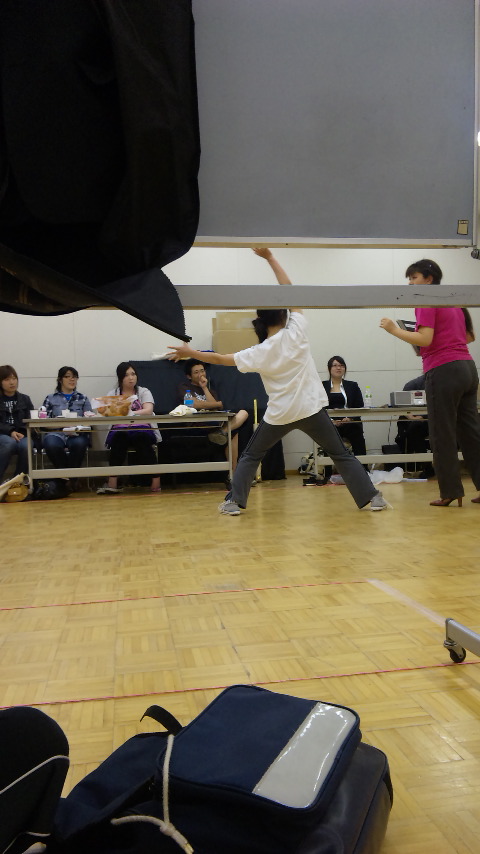 今回は、稽古場所のスペースと、舞台の作り方から、舞台の後ろのほうで待機してることが多いのです。