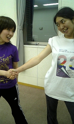 稽古終了後、検討を称えあう香織(左)&ちゃっきー(右)。
