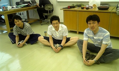 写真左から、菅野崇、遠藤雄史、そして諸用で稽古場に顔を出したらそのままストレッチ&発声に強制参加させられてしまった三浦貴之さん(劇団・風紀委員会)。