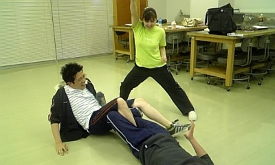稽古前のウォームアップもそこそこに、無防備きわまりないばん(福士)さんにプロレス技をかける遠藤さん。