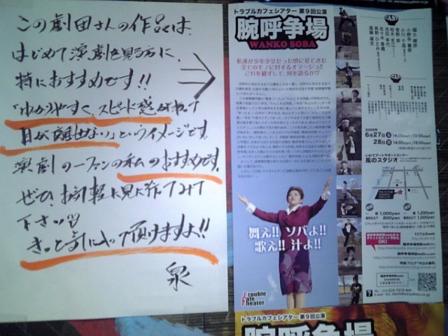 岩手県盛岡市で活動中のアマチュア劇団「トラブルカフェシアター(通称TCT)」の特設ブログ。2009年6月に上演いたしました「腕呼争場-WANKO SOBA-」について、稽古風景や団員たちの日常の様子を日々綴り続けた回顧録です。