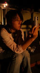 舞台に腰掛け物思いにふけるカンノさん。
